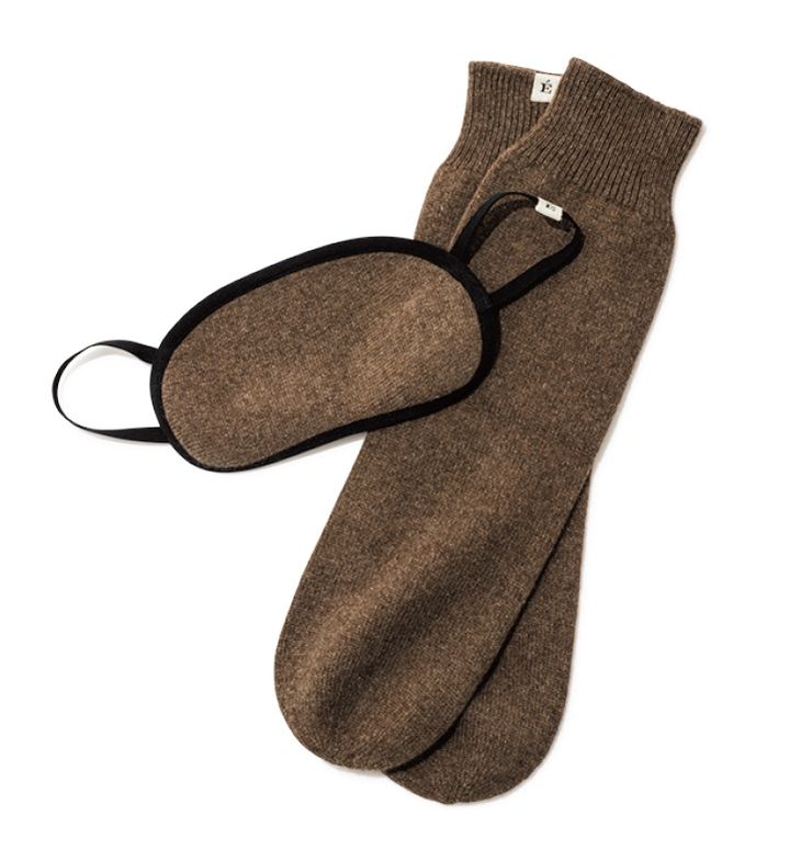 密度が高く柔らかい中東カシミアの特性に着目して作られたアイマスク&靴下のギフトセット。アイマスクの内側は肌触りの優しいシルク素材で入眠効果抜群。専用の巾着付きで旅のお供に最適。¥49,500(エシャぺ/エイトン青山 TEL:03・6427・6335)
