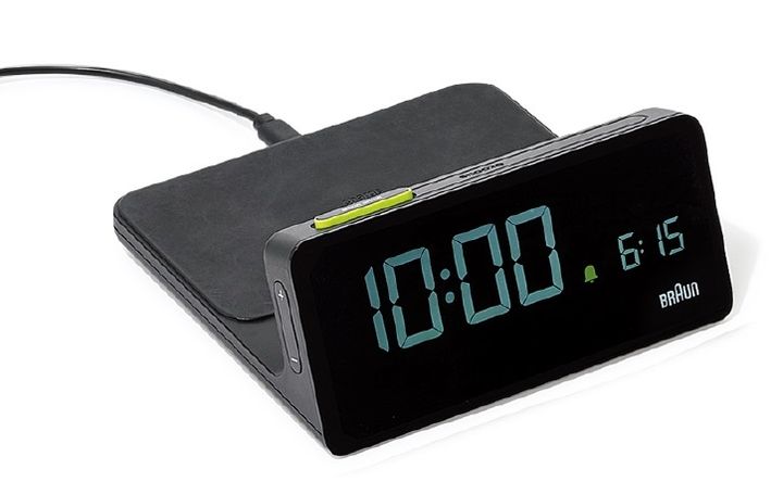 スマホの充電パッドが一体になったデジタルクロック。ディスプレイは周囲の明るさのレベルに応じて自動的に4段階に調整される優れもので、ベッドまわりのマストアイテムに。¥16,500(ブラウン/リビング・モティーフ TEL:03・3587・2463)