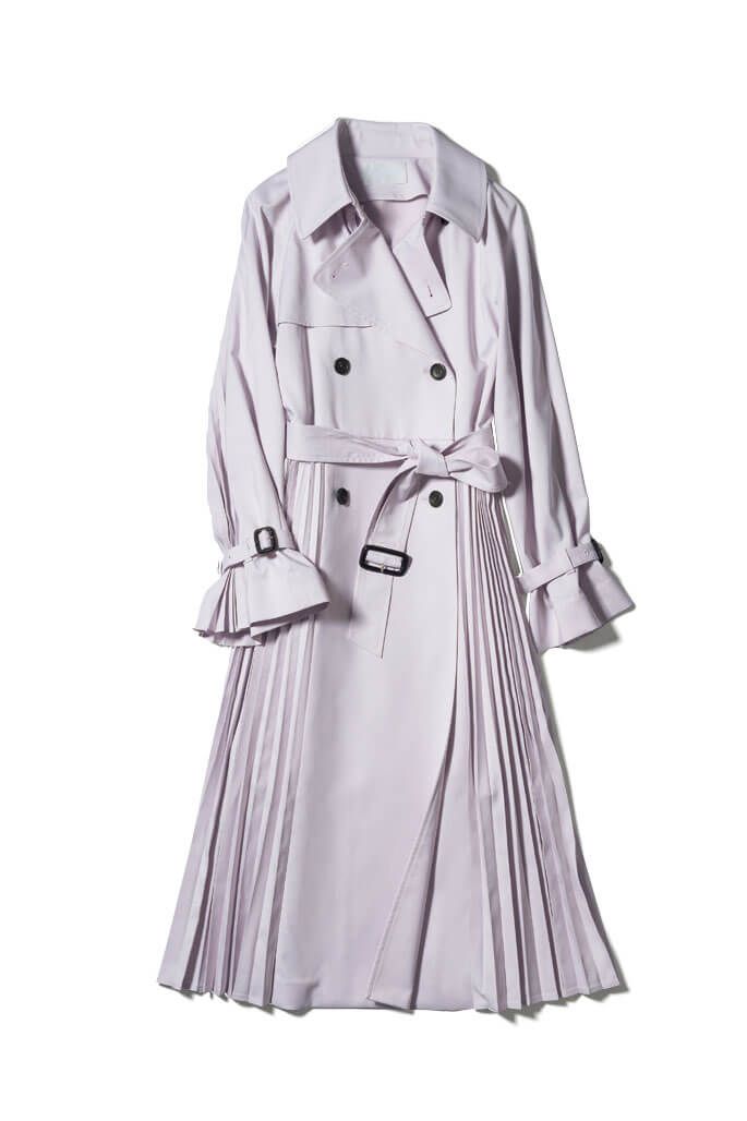 取り外しのできるライナーつきで、シーズンレスに頼りになる1枚。 上品なラベンダーと揺れるプリーツデザインがレディ向き。