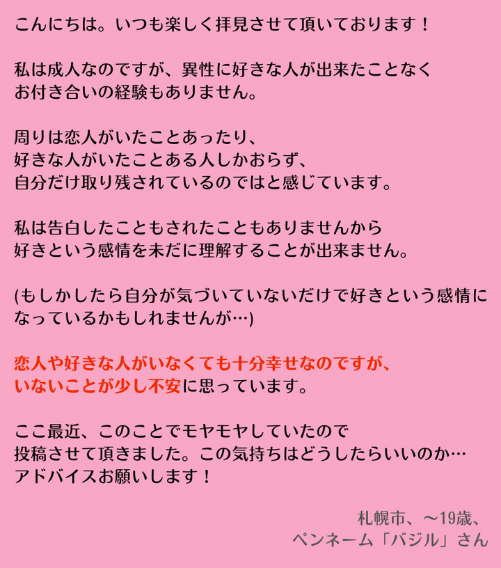 バジルさん。あなたがこれから歩んでゆく道は明るかったり暗かったり、時によって様々だと思います。いつか恋をするかもしれないし、しないかもしれない。そんな自分を「大丈夫かな」って、再び案じる瞬間もあると思う。