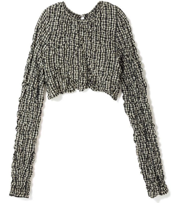 シャーリング加工を施して伸縮性と凹凸感を持たせた2WAYボレロ。トレンドのクロップド丈とロングスリーブのアンバランス感もキュート。¥14,850(メゾンスペシャル/メゾンスペシャル 青山店 TEL:03・6451・1660)
