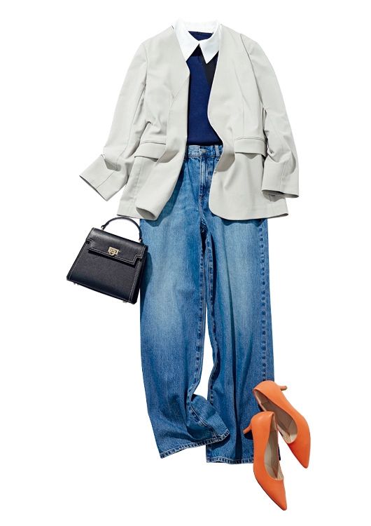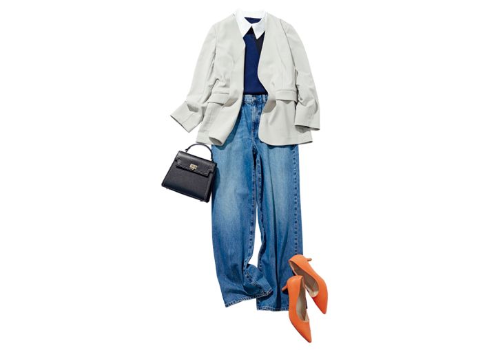 ジャケット×デニムのこなれコーデに挑戦!インは襟付きニットで、ジャケットを脱いでもキレイに見えるよう心配りを。パンプスはあえてのオレンジで、オフの浮かれた気分をアピって。