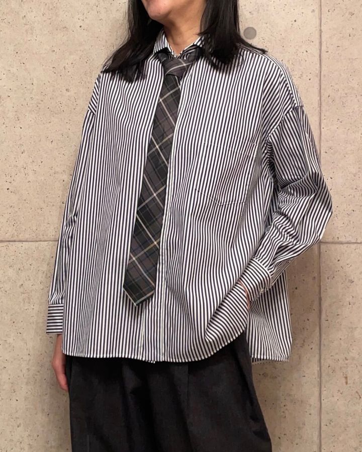 ストライプシャツ¥26,400(ティッカ)、1er Arrondissementのフェイクレザーシャツ、INSCRIREのパンツ、Luca Grossiのシューズ、SHEINのネクタイは本人私物
