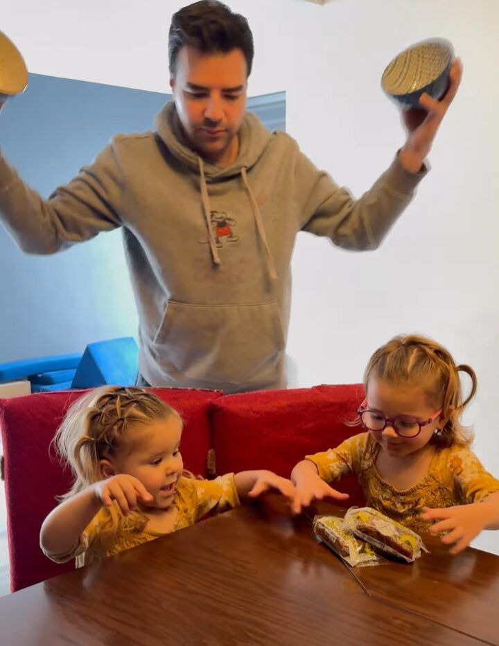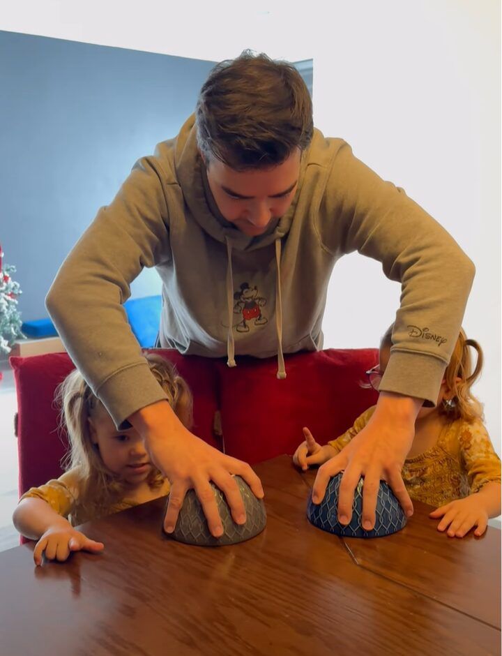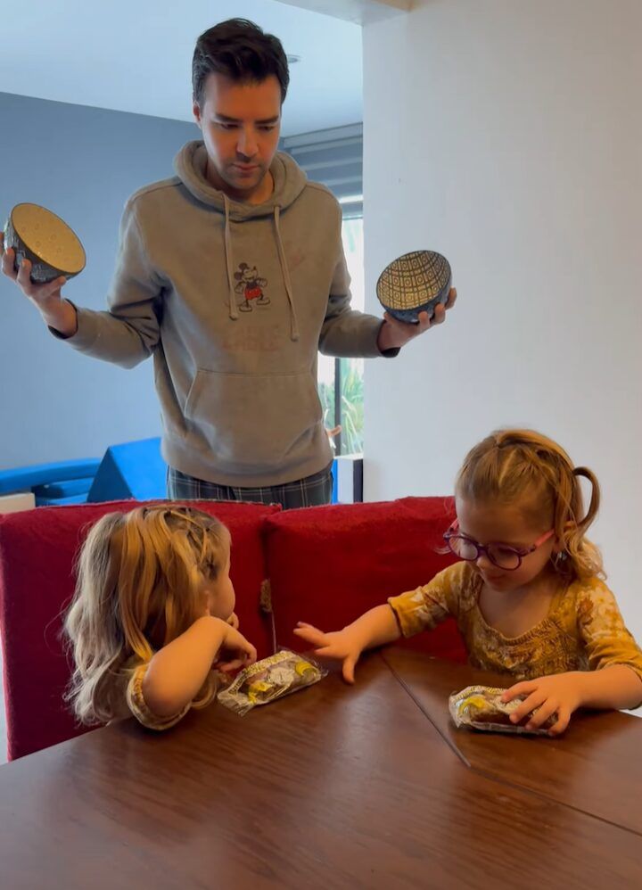 その時、姉妹はテーブルに並んで座っていました。 パパが用意した伏せられた2つのボウルから、お菓子の入った方を当てるゲームに挑戦しているみたいです!
