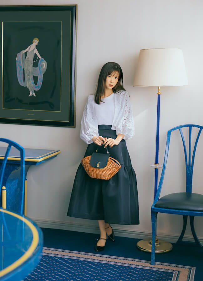 サラッと羽織れるレースジャケットはボリューム袖も愛らしさの秘訣。かごバッグ&メリージェーンで小物も甘口に。