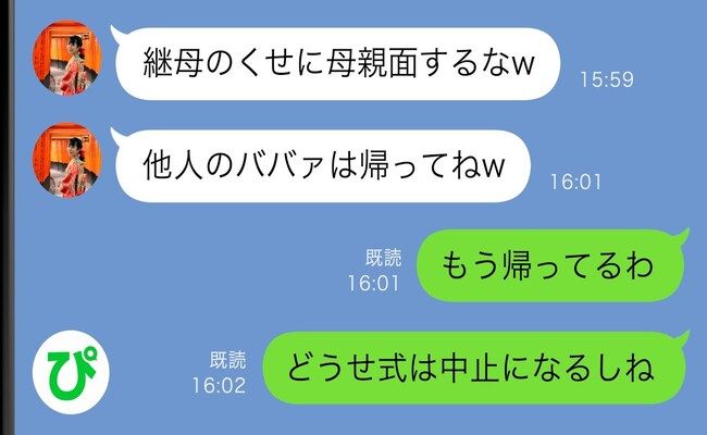 帰宅途中、先ほど式場で別れた継娘から電話とメッセージを山のように着信。しばらく放置してから出てみると、「式を中止にするって彼から言われた! あんた何かしたの!?」と金切り声です。