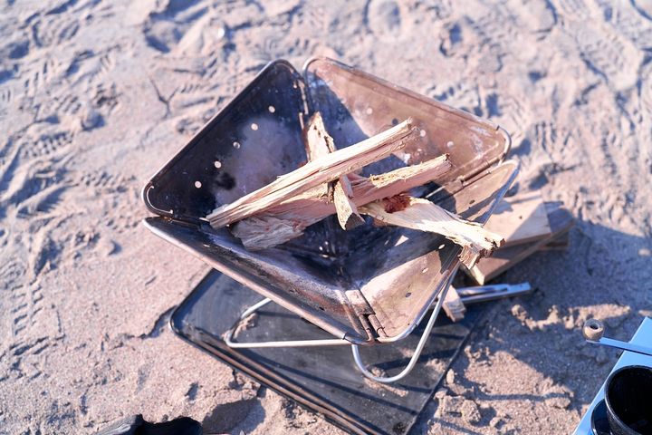 ひとりでもサクサクと道具を組み立てられ、10分もかからずに設営完了!季節により風向きが変わりますが、火を起こしてみてからチェアやミニテーブルの位置を変えていけばOK。焚き火台は重く、火をつけたら動かすのが難しいので、位置をしっかり決めましょう。夕暮れは犬の散歩で波打ち際を歩く人が増えるので、波打ち際から離れた場所に設置するのがおすすめ。また、焚き火の火の粉が飛んでくる可能性があるので、化繊系の洋服は避けるのがベター。動きやすく、汚れてもいい装いで出かけましょう。
