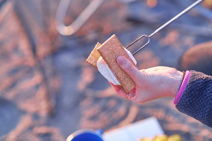 やけどをしないよう気を付けながら、慎重にクッキーにはさみます。スモアは、ふわとろのマシュマロとサクサクしたクッキーの食感の違いがクセになりますね。マシュマロの甘さがしみます。「マシュマロセット」には食材はもちろん、焼くためのスティックや小皿もセットされているので便利。