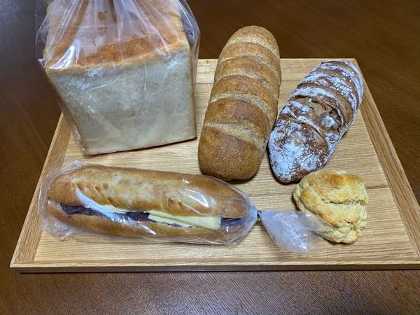 家に到着して、早速いただいてみました!購入したパンはこちらです。↓ 食パン(パン オ ドミ)¥300、ハード系パン2つ(コンプレ¥300、ライロジーネン¥390) あんバターサンド¥300、スコーン¥160
