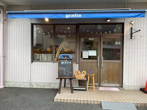 大通から少し入ったところにあるパン屋さん「gratia(グラーティア)」さん。 目の前が駐車場になっているので、車が何台か止まっているとうっかり見逃してしまいそうになりますが、近づくと青色のシェードがよく映えるかわいらしい外観。 お店の前に看板が出ており、日替りのハードパンもあるみたいです!早速入店してみます。
