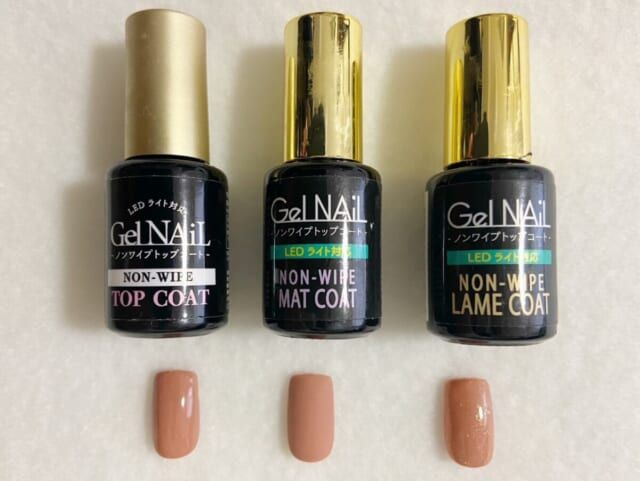 同じカラーでもまったく違うネイルが完成するので、いろいろなパターンのトップコートを持っておくとセルフネイルの幅が広がります。