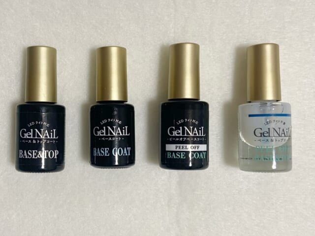 「ベースコート」は1本でトップコートとベースコートの2役を担うタイプと、やや硬めのテクスチャーが特徴的なノンワイプのベースコート、リムーバーを使わずにペリッとジェルを剥がすピールオフタイプのベースコート、UVライト・LEDライト不要の乾くのを待つマニキュアのようなタイプのベースコート&トップコートがあります。
