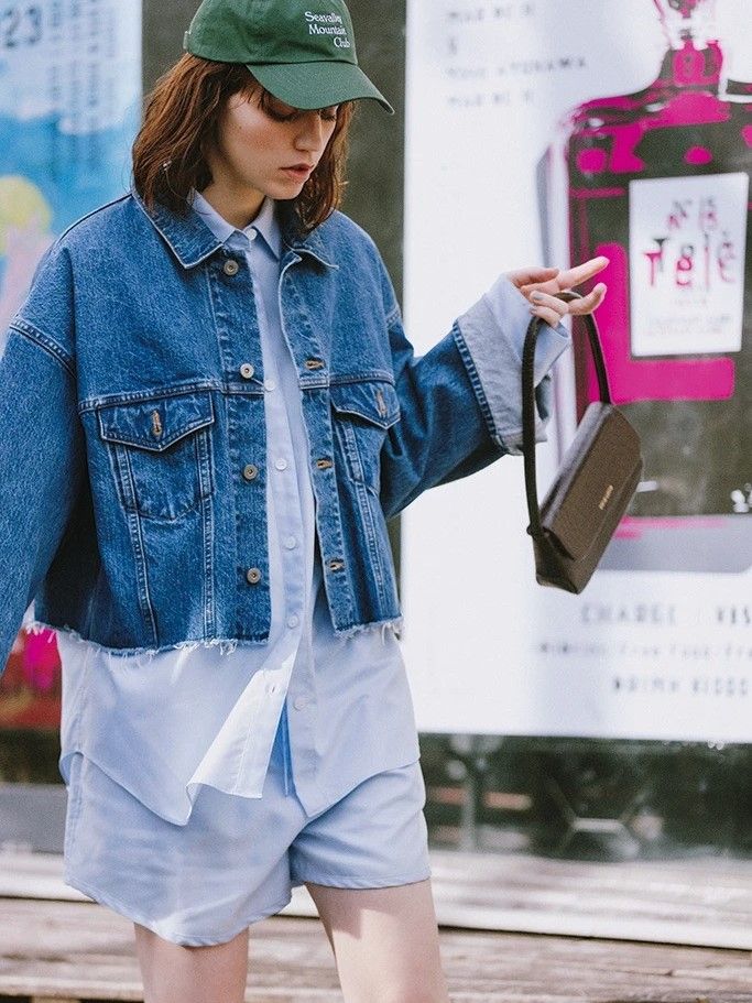 デニムジャケット 46,200円/SACRA(インターリブ) シャツ(4月入荷予定) 49,500円 ショートパンツ(4月入荷予定) 39,600円/ともにTHE NEWHOUSE(アークインク) キャップ 6,490円/SEA(エスストア) バッグ 18,700円/BRIE LEON(ジャック・オブ・オール・トレーズ プレスルーム) ワイドなそででも好バランスな、切りっぱなしの短め丈。