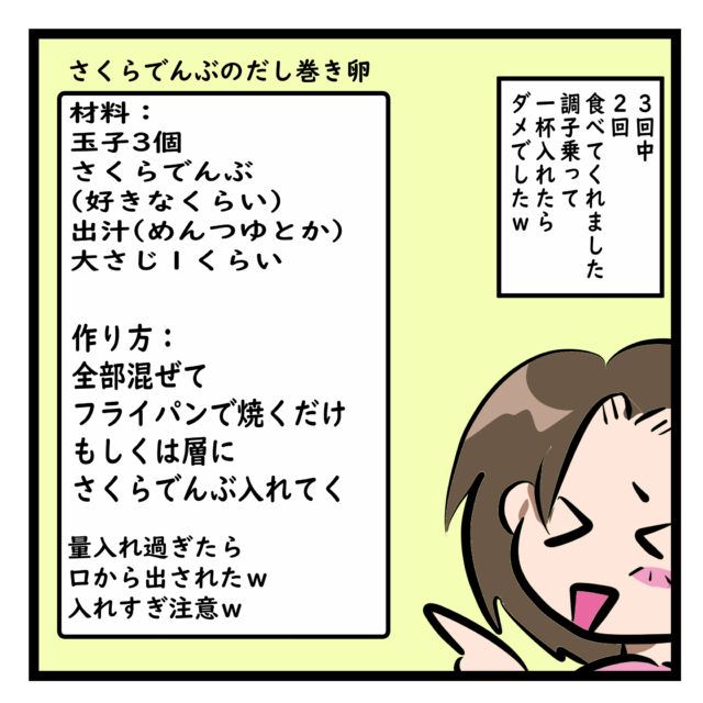 3. 余りがちな「さくらでんぶ」・・お寿司以外でも使えます!さくらでんぶのだし巻き卵|天野芽衣子の日常マンガ