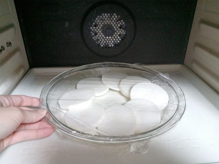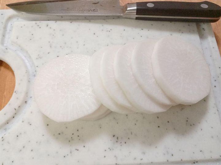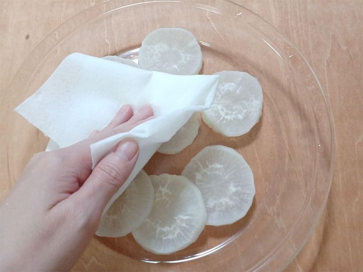 1.大根の皮を剥き、5~7mm幅の輪切りにして8枚作る。500wのレンジで約10分加熱し、水分をふき取る。
