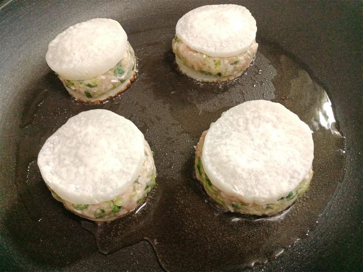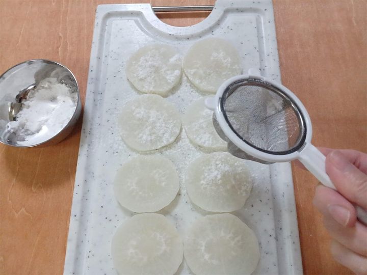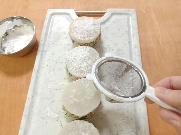 4.1の大根を2枚1組にし、内側に薄く片栗粉をまぶしたら、3の肉だねを4等分にして挟み、さらに全体に薄く片栗粉をまぶしつける。