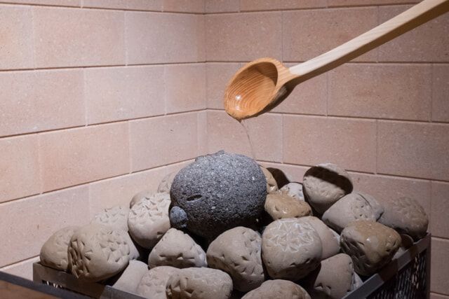 ホテルではたいへん稀少なセルフロウリュができるのも、大きな魅力のひとつ。アロマ水を焼けたサウナストーンにかけると、心地よい香りと強烈な熱さに包まれました。