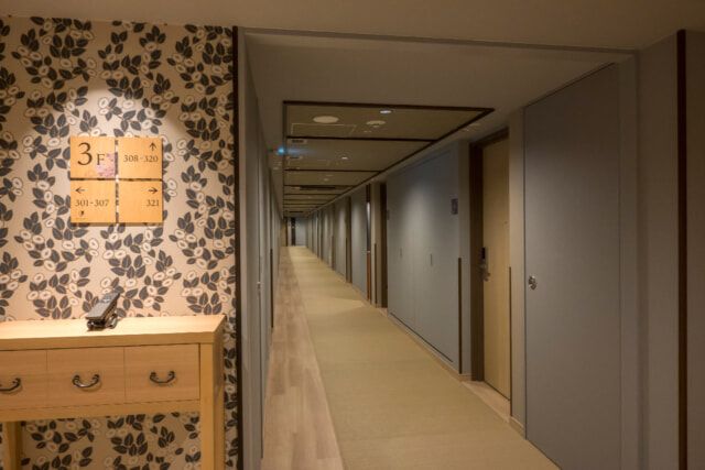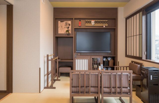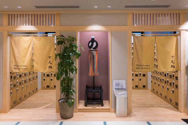 江戸の街を火事から守る火消しが持つ纏(まとい)が飾られる下駄箱。旗印が「のの」になっています。野乃ブランドの宿は全館畳敷きになっていて、素足で気持ちよく過ごせます。玄関に待機するスタッフがキャリーケースの車輪を拭き取るサービスもあって、畳敷きの館内を転がして移動できるのもうれしいです。
