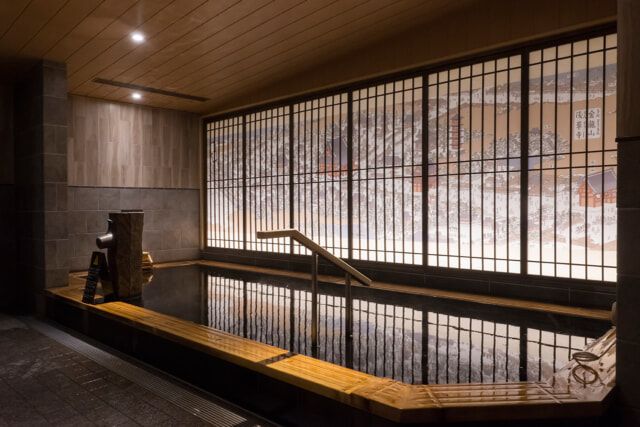 ホテルが立つのは2016年に閉店した温泉銭湯「浅草観音温泉」の跡地で、温泉がそのまま引き継がれています。泉質は26度ほどのナトリウム – 炭酸水素塩泉のため適温に加熱。昭和32年(1957年)から地元浅草で親しまれてきた歴史ある温泉に浸かることができます。障子を思わせる壁面には、江戸時代の浅草寺の様子が描かれ、五重塔の位置など現在との違いも楽しめます。