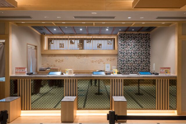 チェックインはスタッフがタブレットを使いながら行います。フロント背後の窓には、鯛や打ち出の小槌、扇といった日本古来の縁起物の木彫りがはめ込まれ、古くから浅草寺と共に賑わう浅草の街の活気を伝えます。