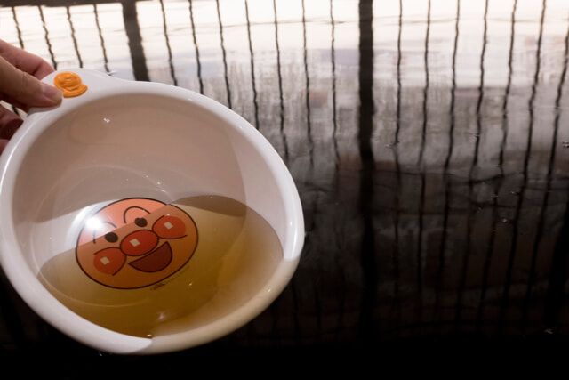 ▲色の濃い黒湯が魅力の天然温泉。子供用の白色の桶でお湯をすくうと、色の濃さが判ります