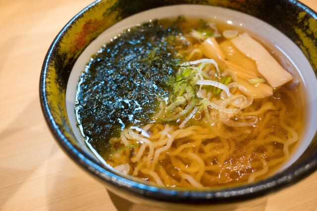 21時30分から23時まで、地下1階のレストランで提供されるあっさり味の醤油ラーメン。この味にハマるリピーターも多いです。あおさがたっぷりはいっていて、美味しくいただきました。