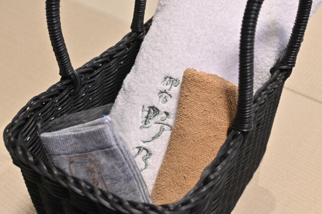 ▲備え付けの湯かごの中には、タオル類の他に足袋ソックスも入っています