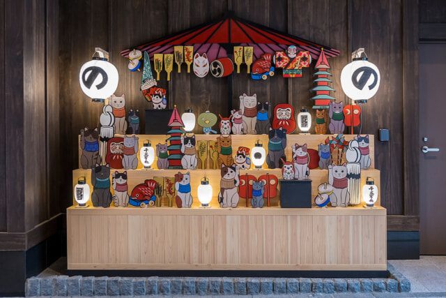 建物の南北をつなぐ通路にはひな壇が設けられ、招き猫や羽子板、コマや鯛などの縁起物が並びます。よく見るとドーミーインのオリジナルキャラクター、ドーミーいんこもまぎれています。