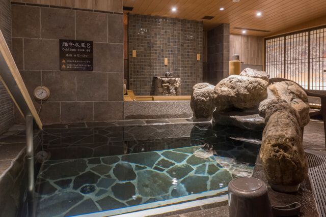 水風呂には水温を管理するチラー(冷却水循環装置)を備えます。通常の水温は12~13度ほどでキリっと冷たくスッキリします。