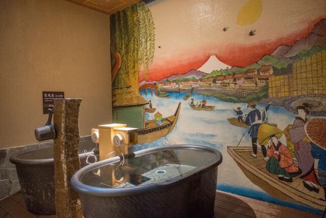 外湯には2つ壷湯が置かれ、それぞれ約40度のぬる湯と約43度の熱湯になっています。男湯のつぼ湯がある壁には、運河をめぐらせ水上輸送が盛んだった江戸の風景を思わせる画が描かれます。船頭の中にドーミーいんこもいるのでぜひ探してみてください。