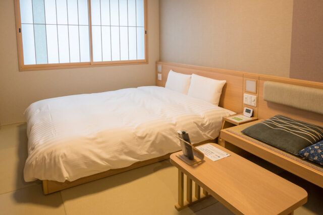 ダブル、ツイン、トリプルなど1名から4名まで利用できる多彩な客室タイプを117室用意。室内は畳敷きで、アメリカ・サータ社のベッドマットを採用しています。
