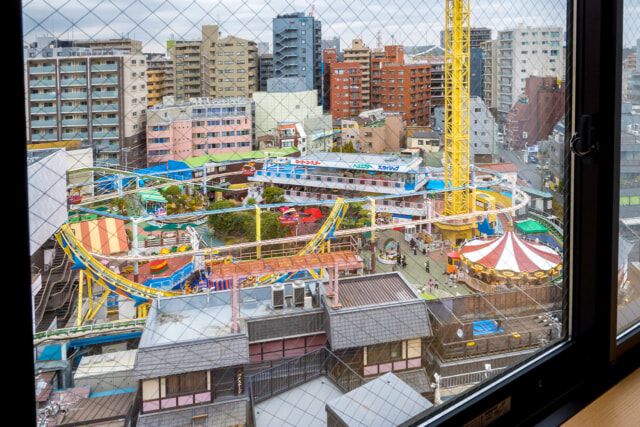 日本最古の遊園地「花やしき」。一部の客室からはローラーコースターやメリーゴーランドが間近に見られ、夜はネオンがピカピカ光ってとてもキレイです。