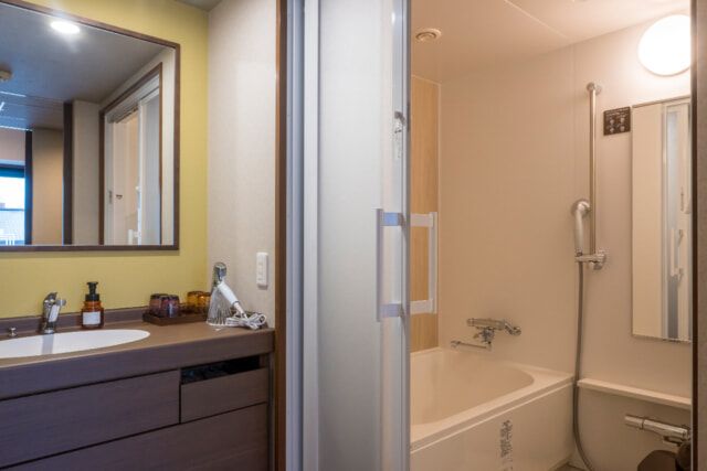 大浴場を備えるドーミーインや野乃ブランドの客室は、ほとんどのバスルームがシャワーブースのみですが、御宿 野乃浅草別邸ではデラックストリプルルームだけにバスタブを設置。