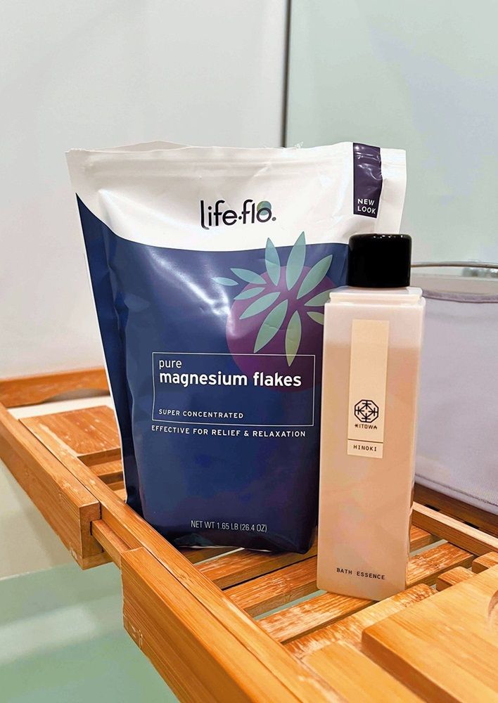 毎晩必ず湯船に浸かるのがマイルール。「より効率よくカラダを温めるため、入浴剤はマスト。〈iHerb〉で購入しているマグネシウムのフレークは、短時間でも汗をしっかりかけて、カラダが芯から温まり、疲れが取れます。さらに〈KITOWA〉のHINOKIのバスエッセンスを入れると、香りがよく、よりリラックスできるんです」