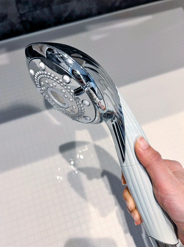 湯船にも入れたりとフル活用中の〈リファ〉。「シャワーの一番強いモードで全身を流したあとはストレートモードに切り替えたシャワーヘッドをお湯の中へ。乳白色に濁り、カラダがポカポカになるシルキーバスが作れるのもお気に入り」