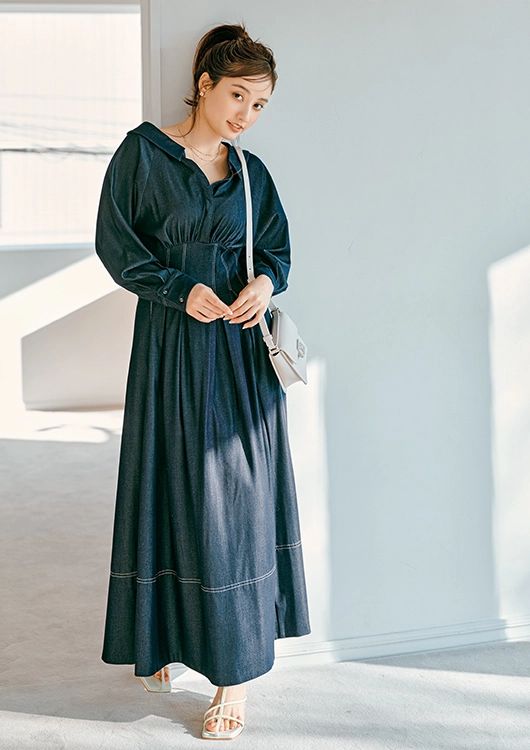 抜け感のある襟元、細見えが叶うハイウエスト切り替え・・・トレンドのデニムワンピも、Her lip toの手にかかれば、今っぽさはそのまま、メンズの好き♡がギュッと詰まった1枚に。