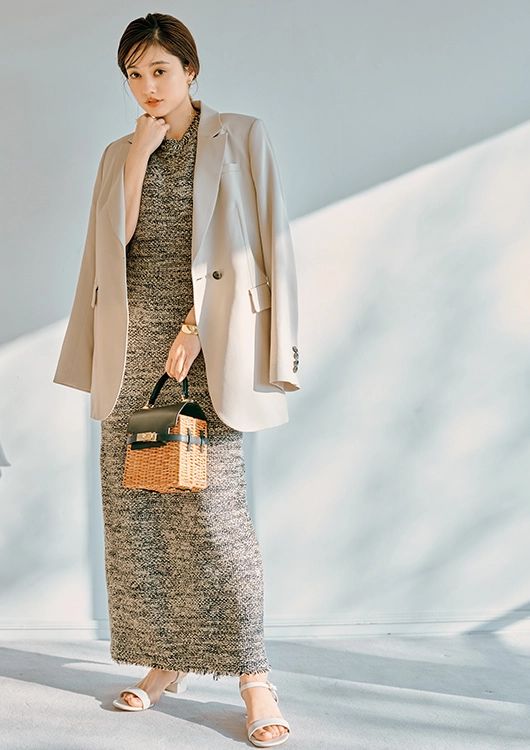 ワンピース¥19,800、肩にかけたジャケット¥25,300/ともにアニュアンス ピアス¥2,640/セピカ、バッグ¥24,200/ジネス(ともにジオン商事) バングル¥30,140/ソコ(ズットホリック) サンダル¥8,900/CHARLES&KEITH JAPAN