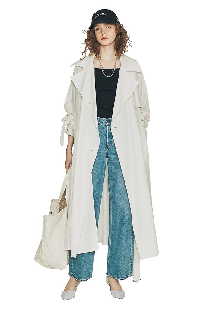 オフホワイトビッグトレンチコート 39,600円/FRAY I.D(FRAY I.D ルミネ新宿2店) キャミソール 13,750円/FLORE FLORE(エスケーパーズオンライン) デニムパンツ 15,180円/MOUSSY(バロックジャパンリミテッド) キャップ 4,400円/ニューエラ ネックレス 33,000円/フォークバイエヌ(UTS PR) バッグ 13,200円/アッパーハイツ(ゲストリスト) パンプス 18,150円/ダイアナ(ダイアナ 銀座本店)