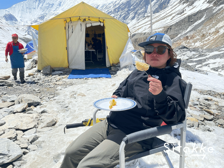 ダウラギリベースキャンプで天気がいいので外でランチ