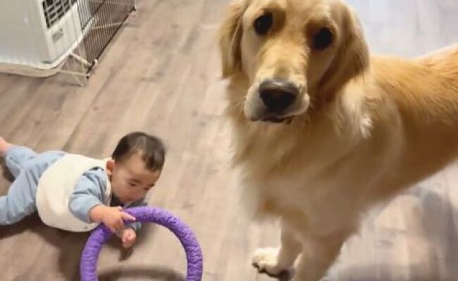31万回再生!パパと遊んでいる赤ちゃんと遊びたい大型犬→考えに考えての行動に「やさしい」の声
