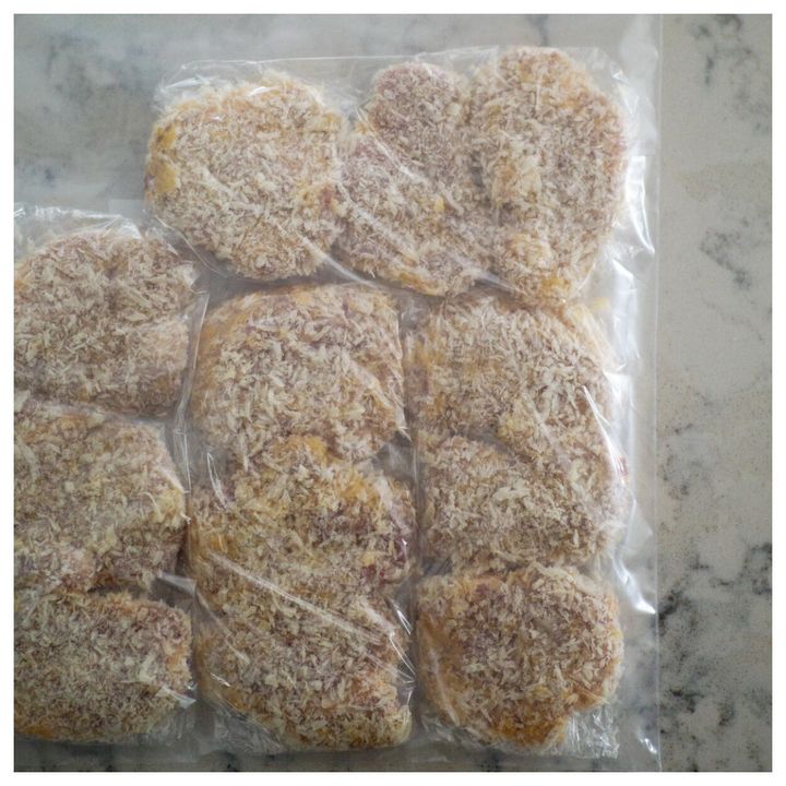 カツはまとめて下ごしらえしておき、残りは冷凍しておくと便利。ころもまでつけたら、3個ずつラップに包み、冷凍用保存袋へ。保存の目安は1か月。