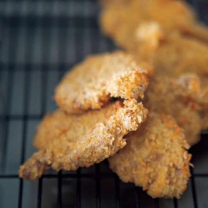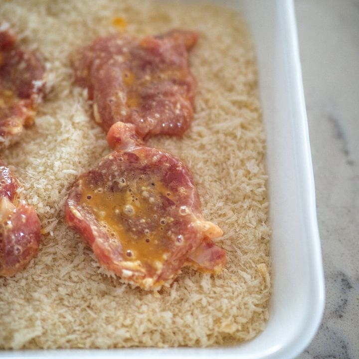 豚肉は厚さ約1cm、12切れに切る。包丁の背で厚さ7mmになるまでたたく。塩、こしょうをふる。小麦粉、溶き卵、パン粉を順に薄くまぶす。