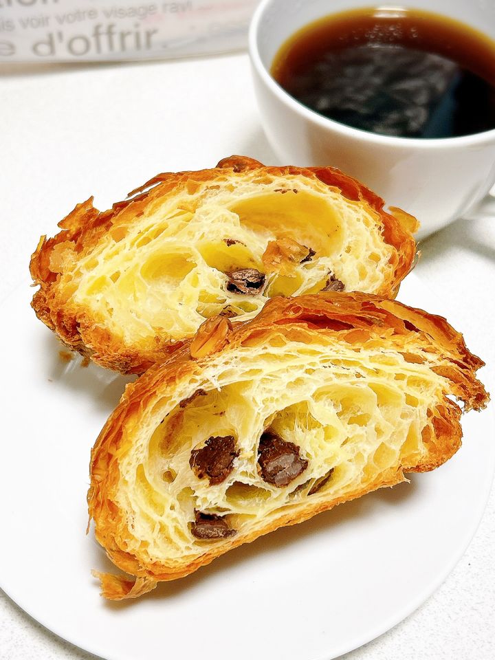 軽い層が重なったデニッシュ生地に、チョコレートがプラスされている