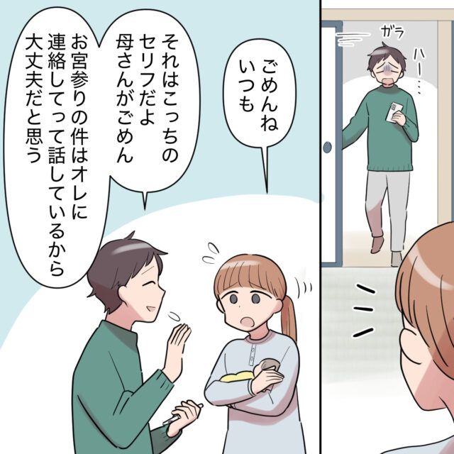 「それはこっちのセリフだよ。母さんがごめん!お宮参りの件はオレに連絡してって話したから大丈夫だと思う」