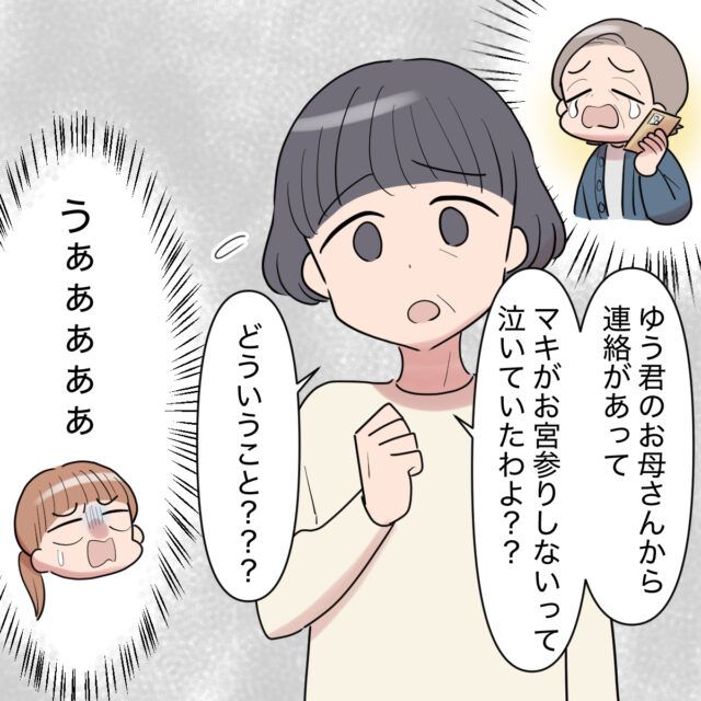 「ゆうくんのお母さんから連絡があって、マキがお宮参りしないって泣いてたわよ??どういうこと???」