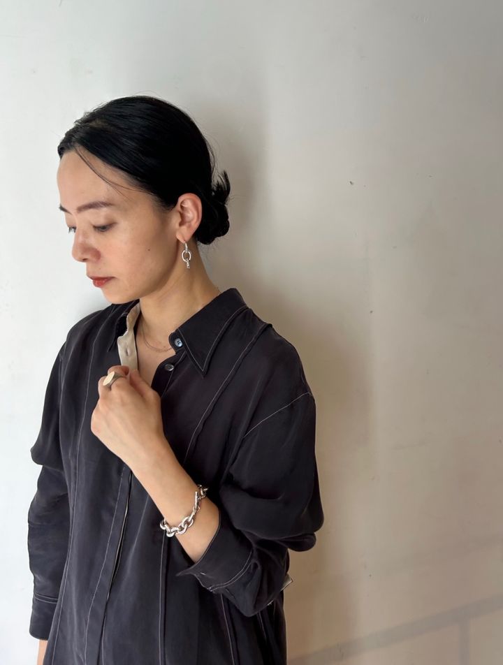「春シック。相変わらず落ち着くダークトーンコーデではありますが、ツヤ感のある素材にサイドスリットの入ったシャツで春らしさを、シルバージュエリーで女性っぽさを演出しました。大ぶりのシルバージュエリーを身につけると華奢見えする気がして好きです」