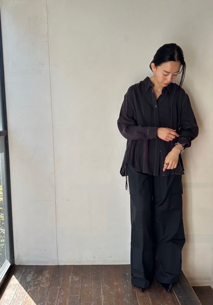 「上品な光沢感に滑らかな肌触りが特徴のキュプラ素材は快適な着心地。両サイドに付いたヒモは気分で前後に結んだり今回のように垂らしたりとアレンジできるのもお気に入り。白いステッチもポイントです」シャツ¥46,200(イン/ショールームリンクス)
