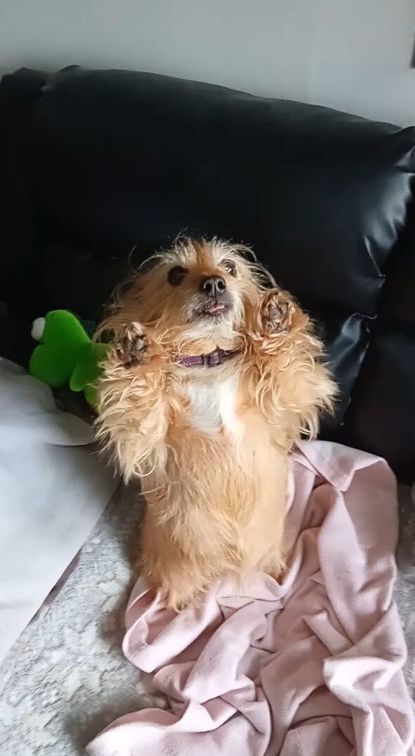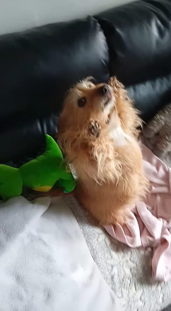 ソファの上にいたミリは、後ろ足でスクッと立ち上がって飼い主さんを待ってくれていました。