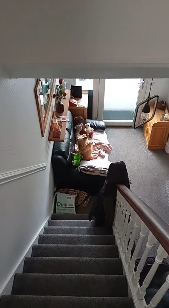 ベッドルームから、階下へ降りていく撮影者さん。 どうやら、階段の下に置かれたソファでさっそくミリが待ってくれているようですよ!!