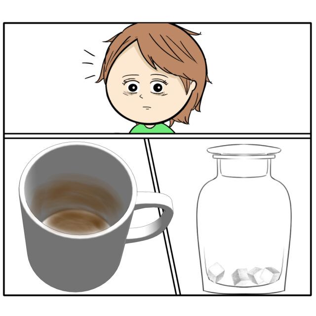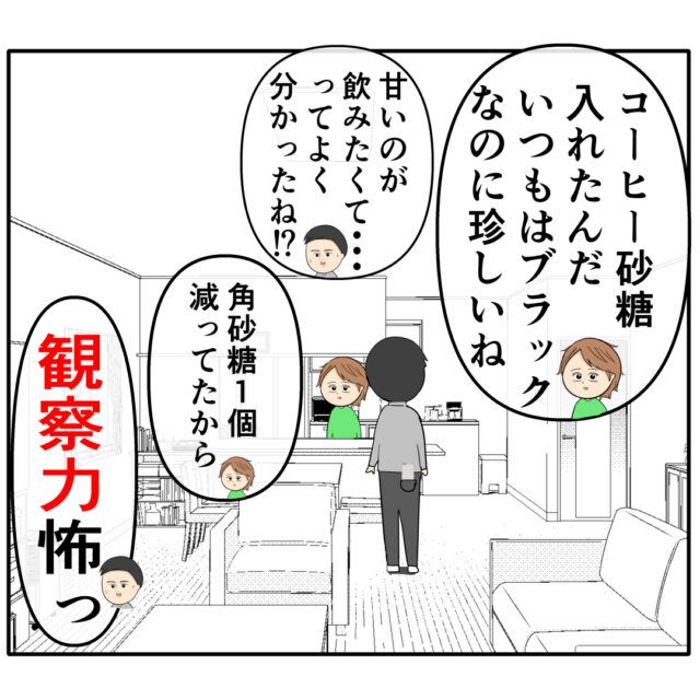いつもはブラックコーヒーを飲む外面さんですが、今日は砂糖を入れて飲んでいたことに気付き、すみれさんは「珍しいね」と外面さんに言いました。